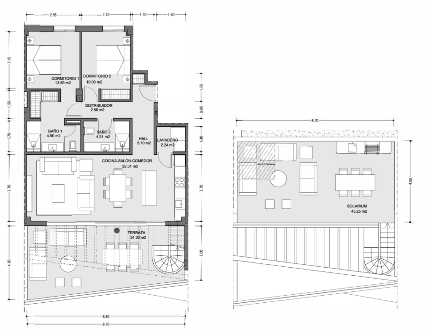 One of the most outstanding features of this exclusive residence is its impressive outdoor space. The main living area opens onto a generous 34.30 m² terrace, while the private 45.25 m² solarium offers an exceptional setting for sunbathing, outdoor dining, relaxing and making the most of the Mediterranean lifestyle in complete privacy.