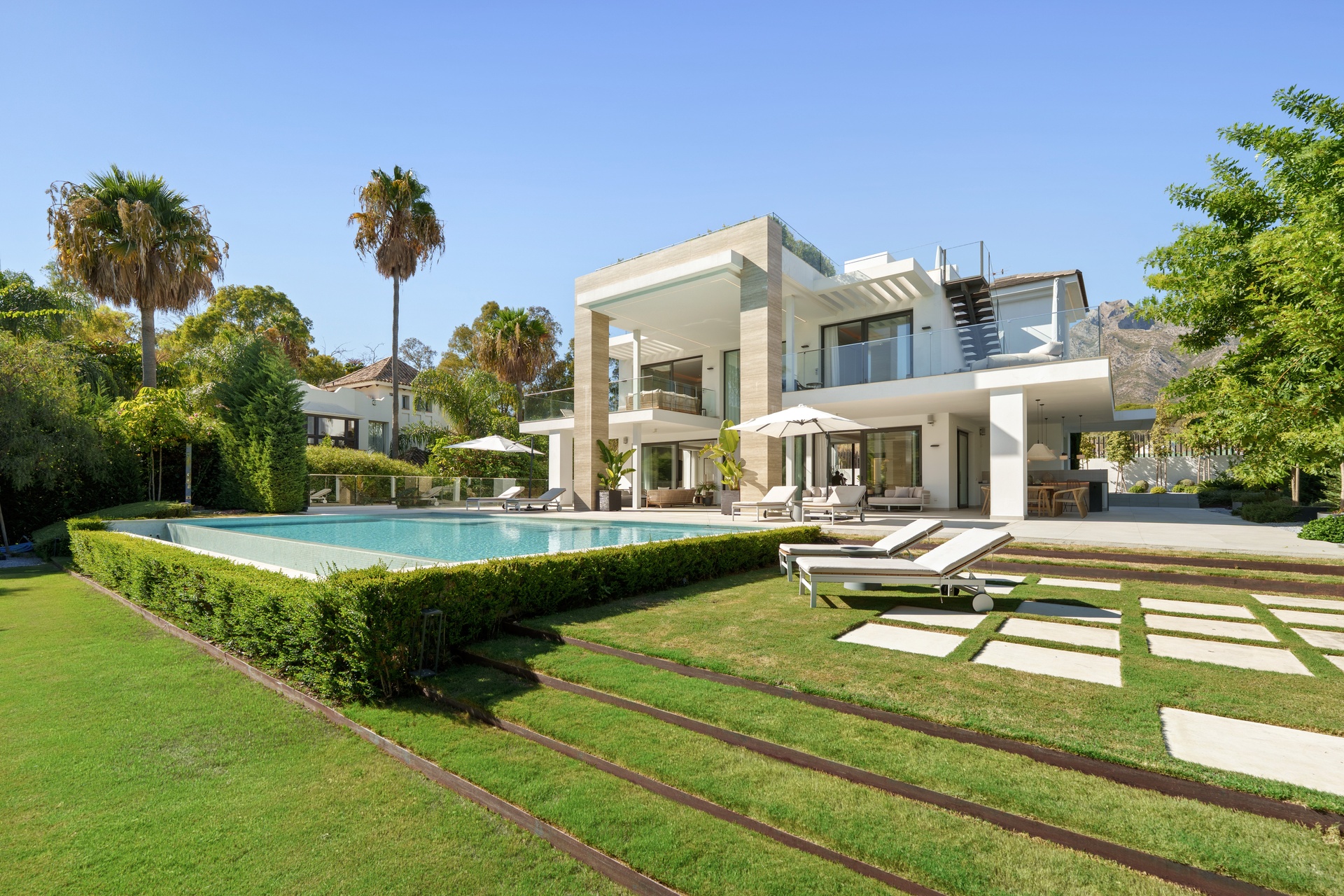 En el exterior, amplias terrazas, lounge en la azotea con jacuzzi y una piscina infinita enmarcan un refugio privado para quienes buscan lo extraordinario. Con jardines paisajísticos y garaje para tres coches, esta residencia ofrece exclusividad y distinción en una de las direcciones más codiciadas de Marbella.