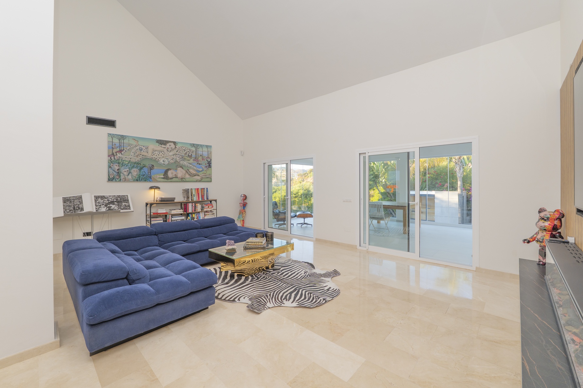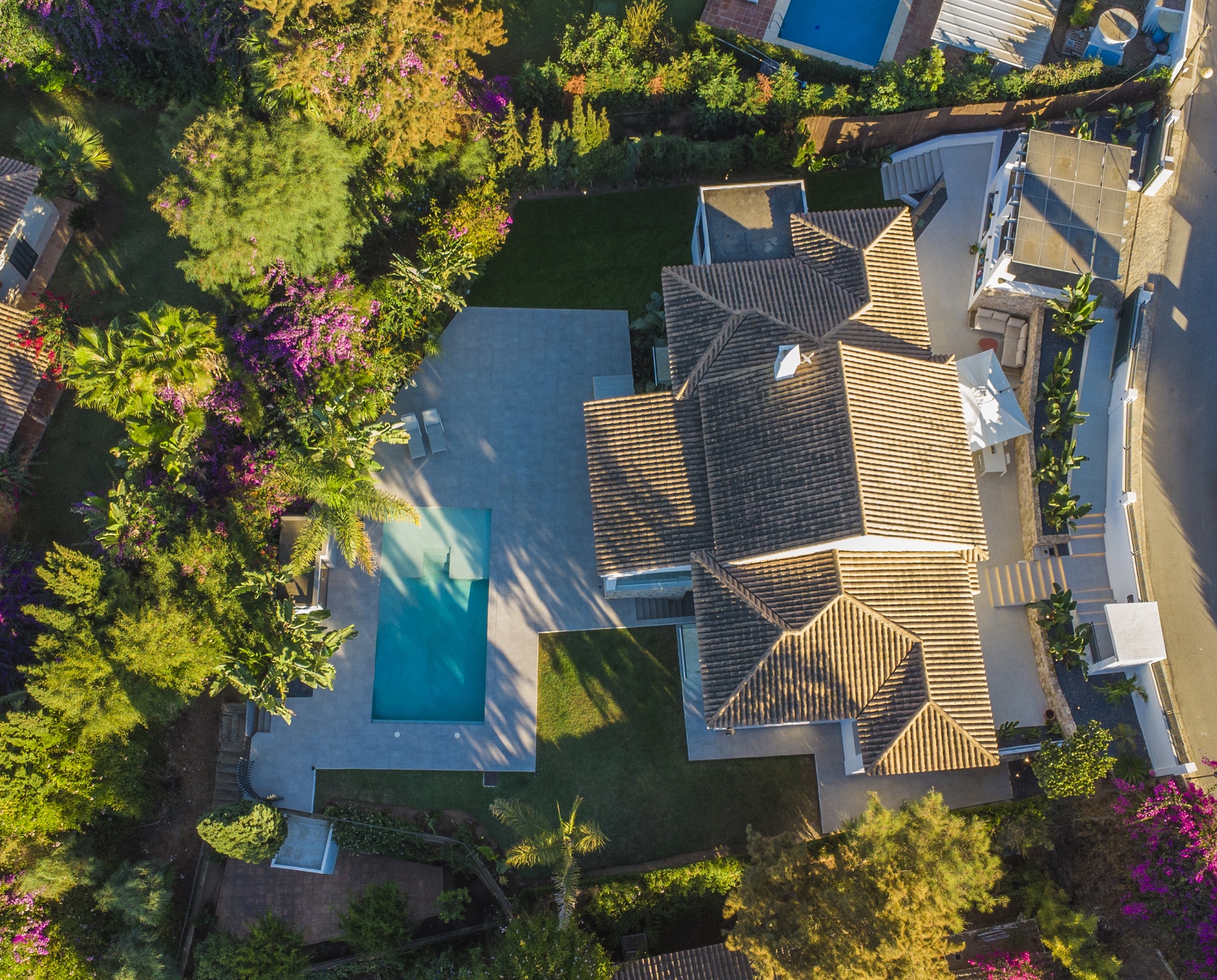 Situada sobre una parcela de aproximadamente 1.000 m², la villa cuenta con 198,61 m² construidos, una sala de cine de unos 35 m² y terrazas que suman unos 150 m².