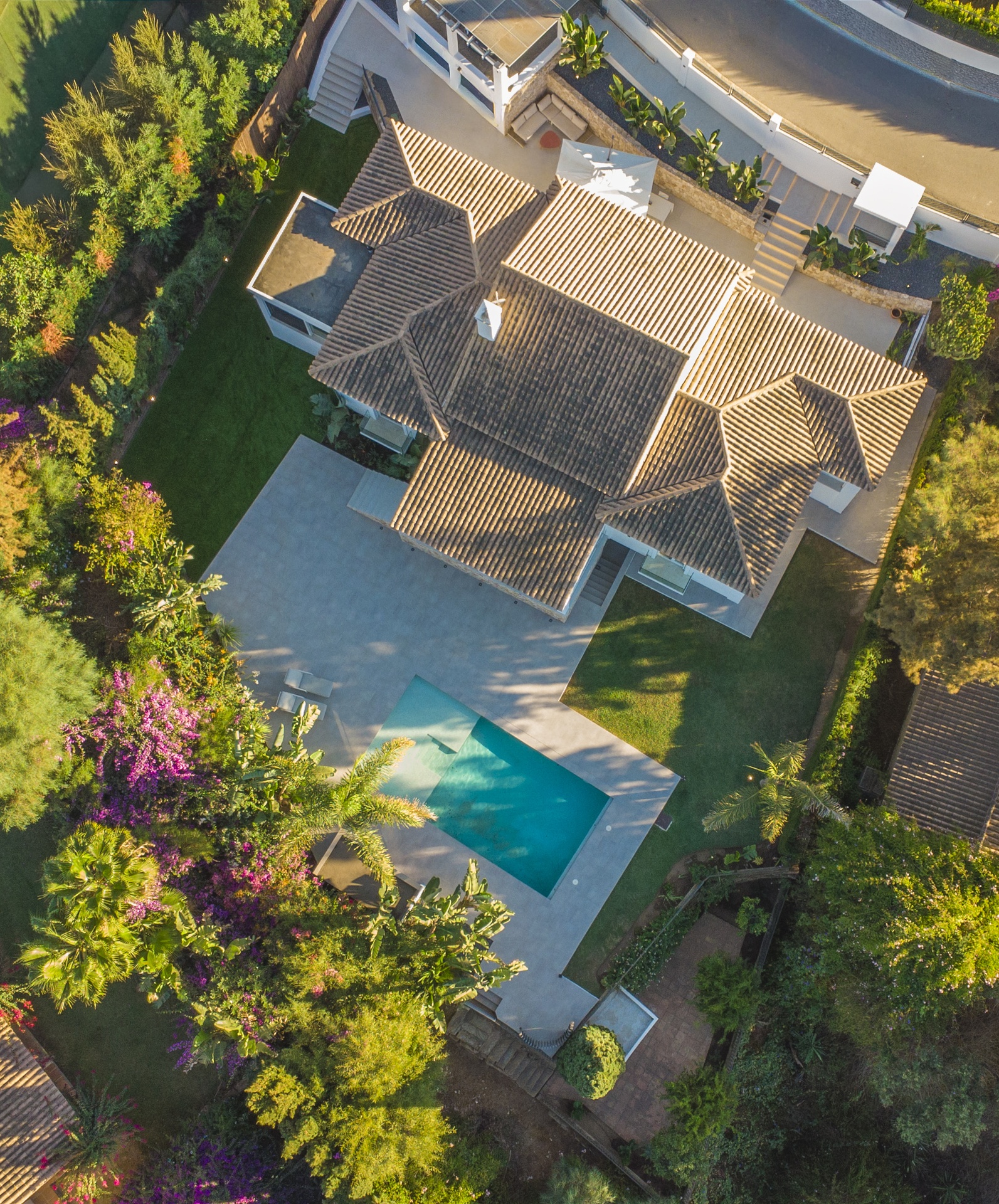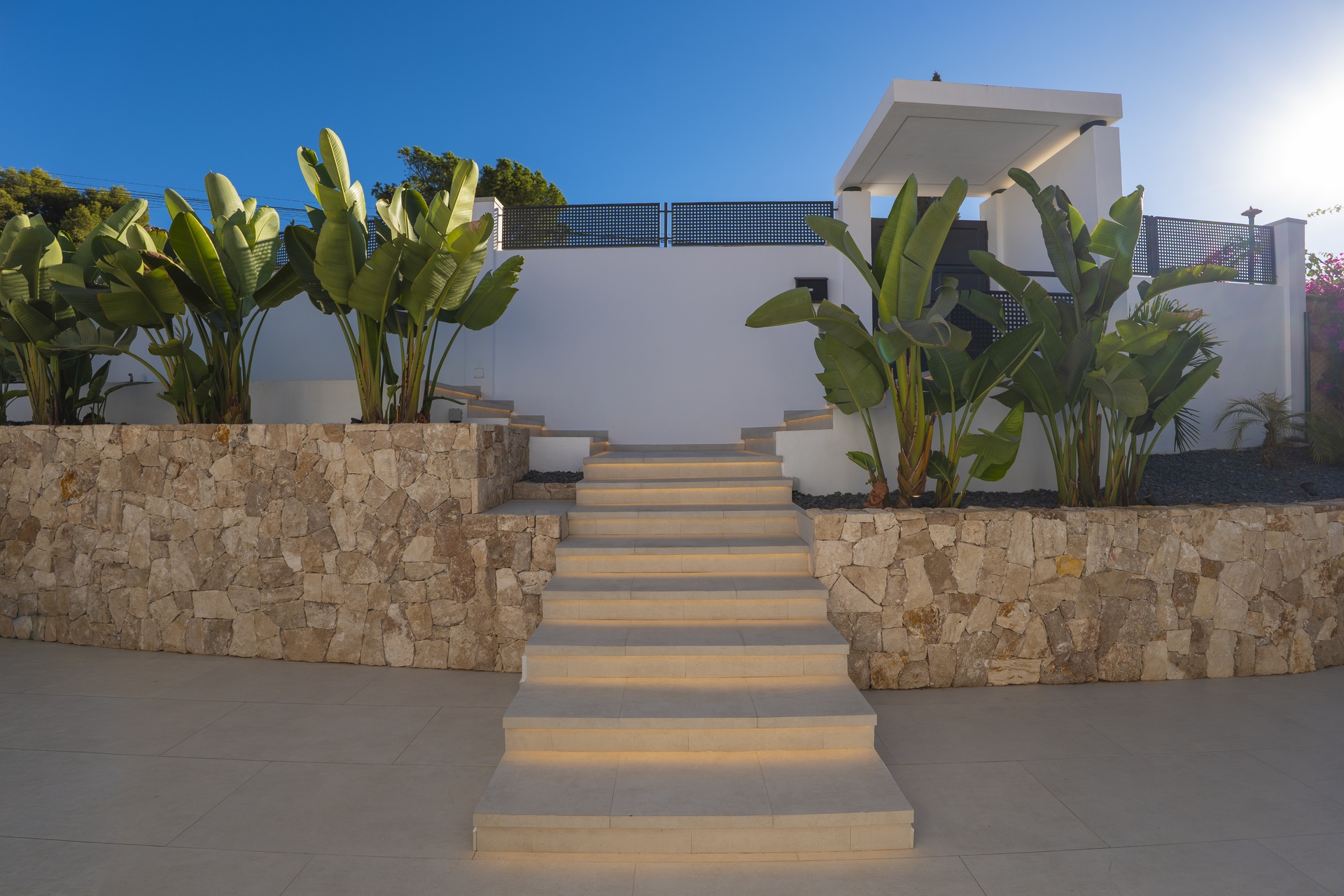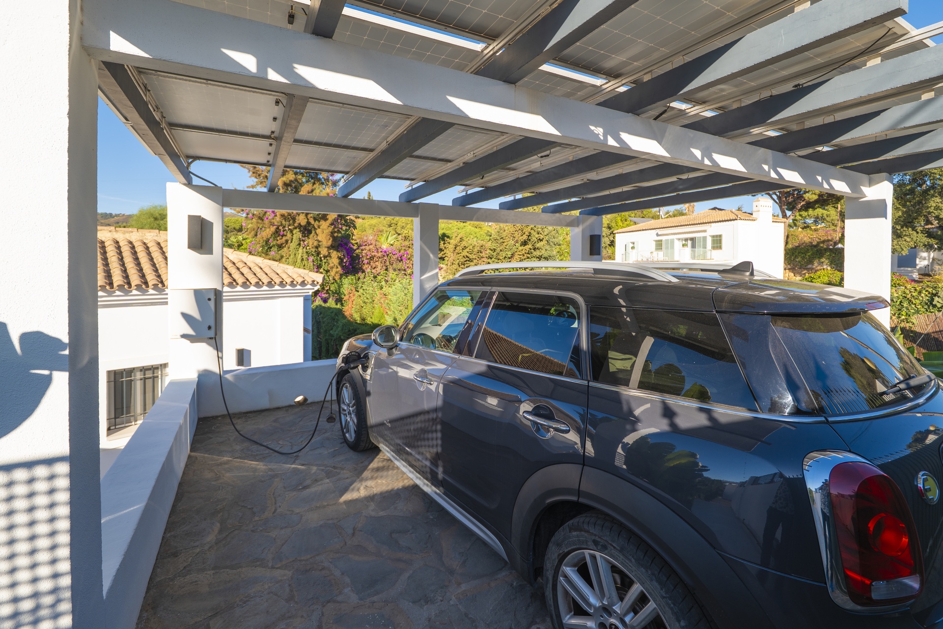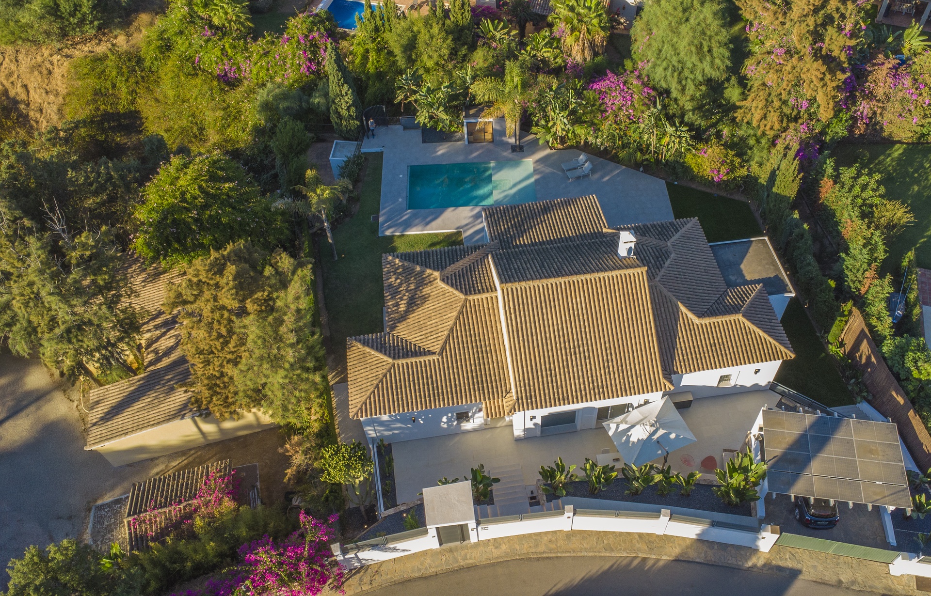 El exterior combina privacidad, luz y estilo: una encantadora zona frontal con terrazas ajardinadas recibe a los visitantes, y el parking cubierto para dos vehículos con portón automático completa el conjunto con discreta elegancia.