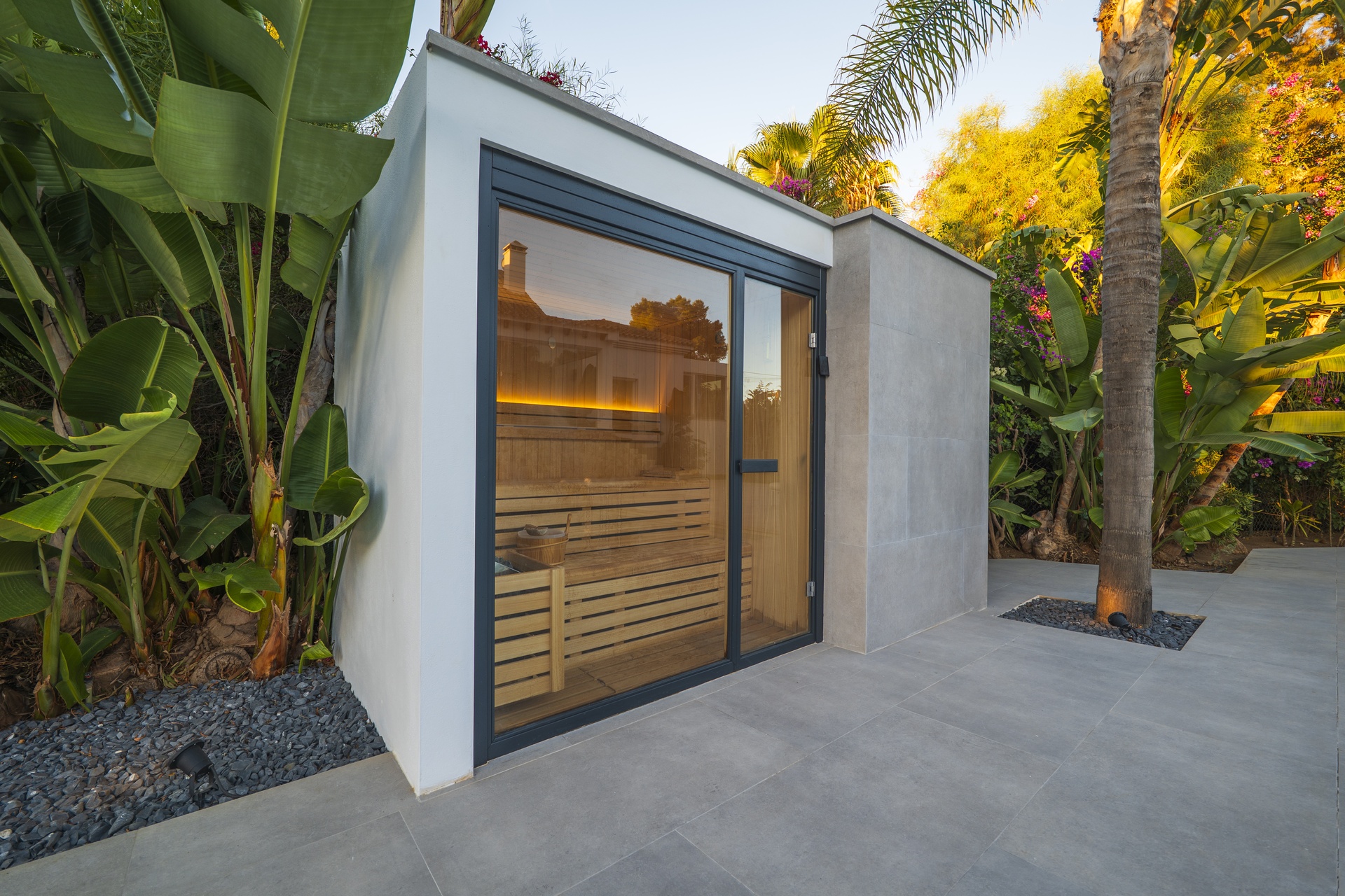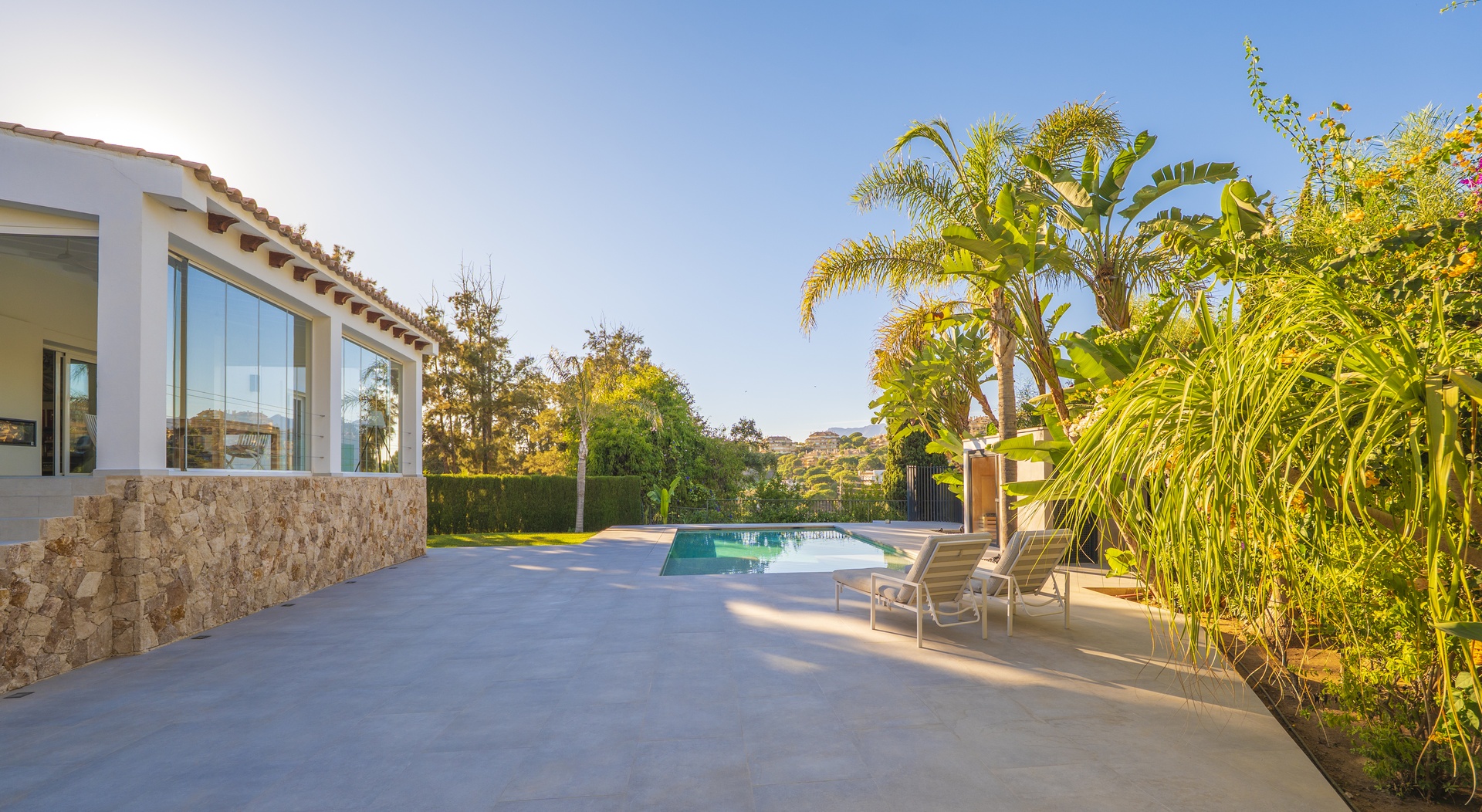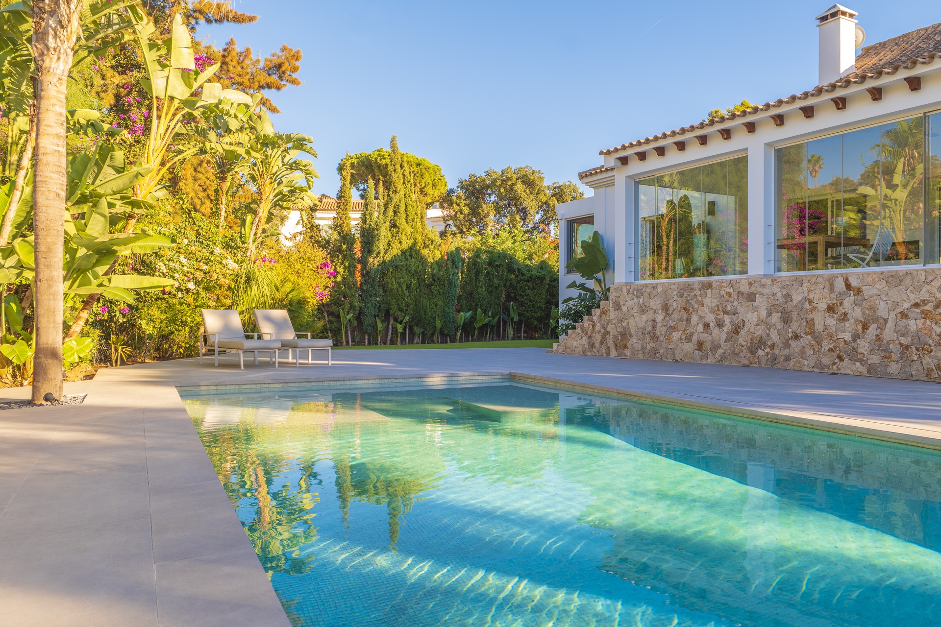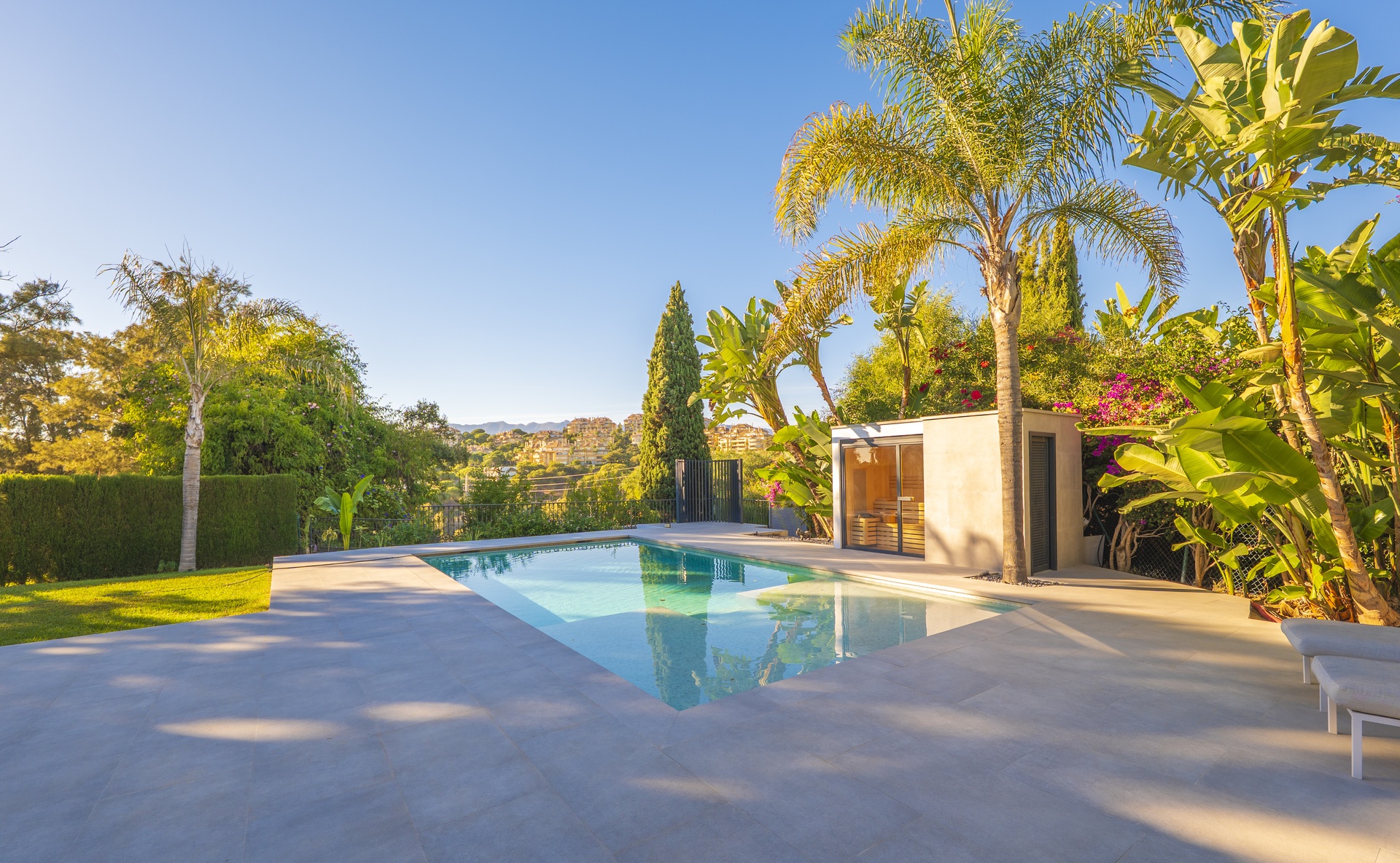 Desde allí, el jardín privado ofrece un oasis de calma con una piscina nueva de líneas minimalistas, amplias zonas de solárium, una sauna privada y una sala de cine o de ocio con baño completo —el espacio ideal para relajarse o compartir momentos especiales.