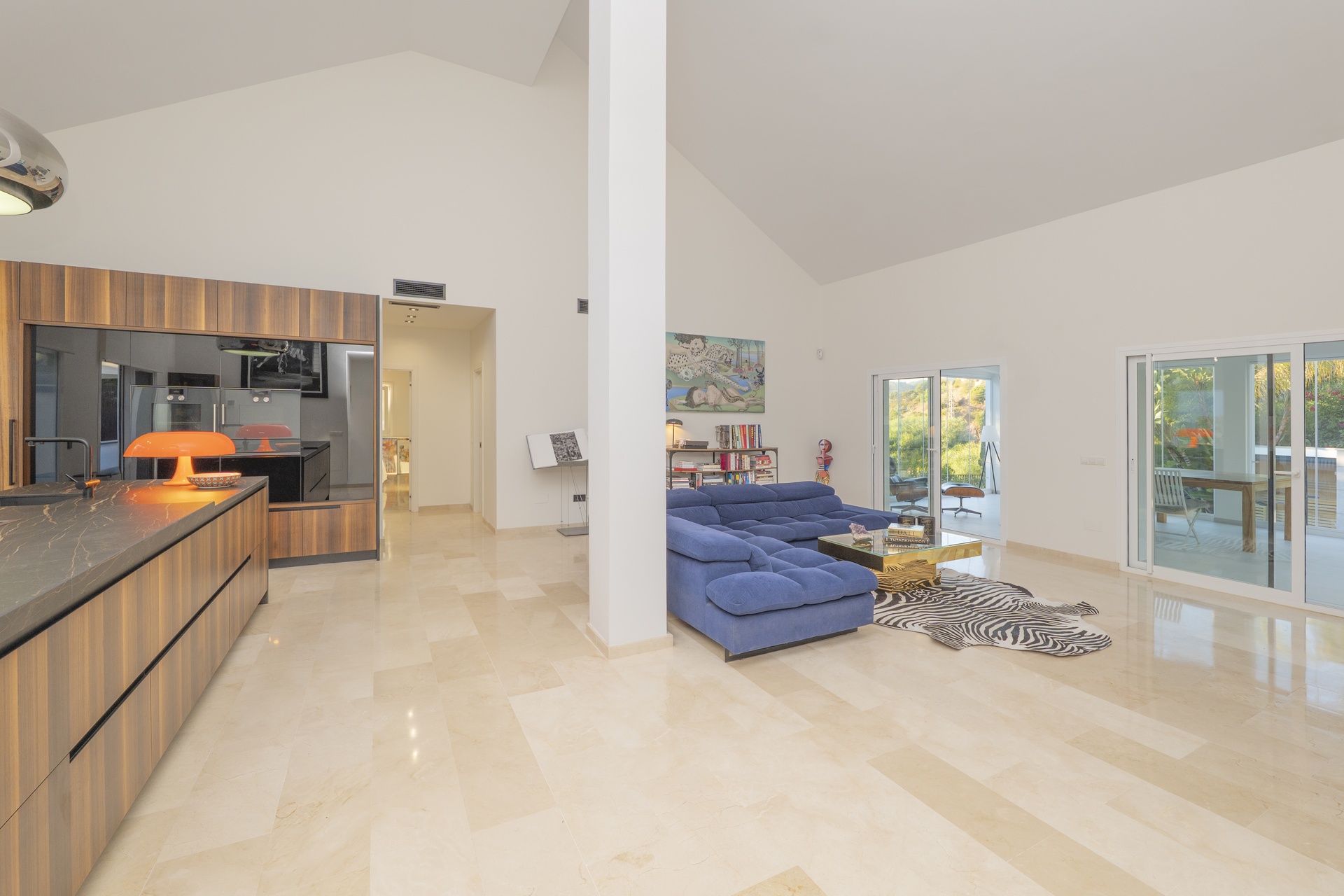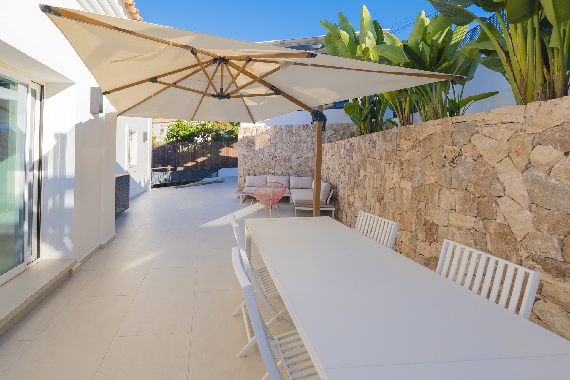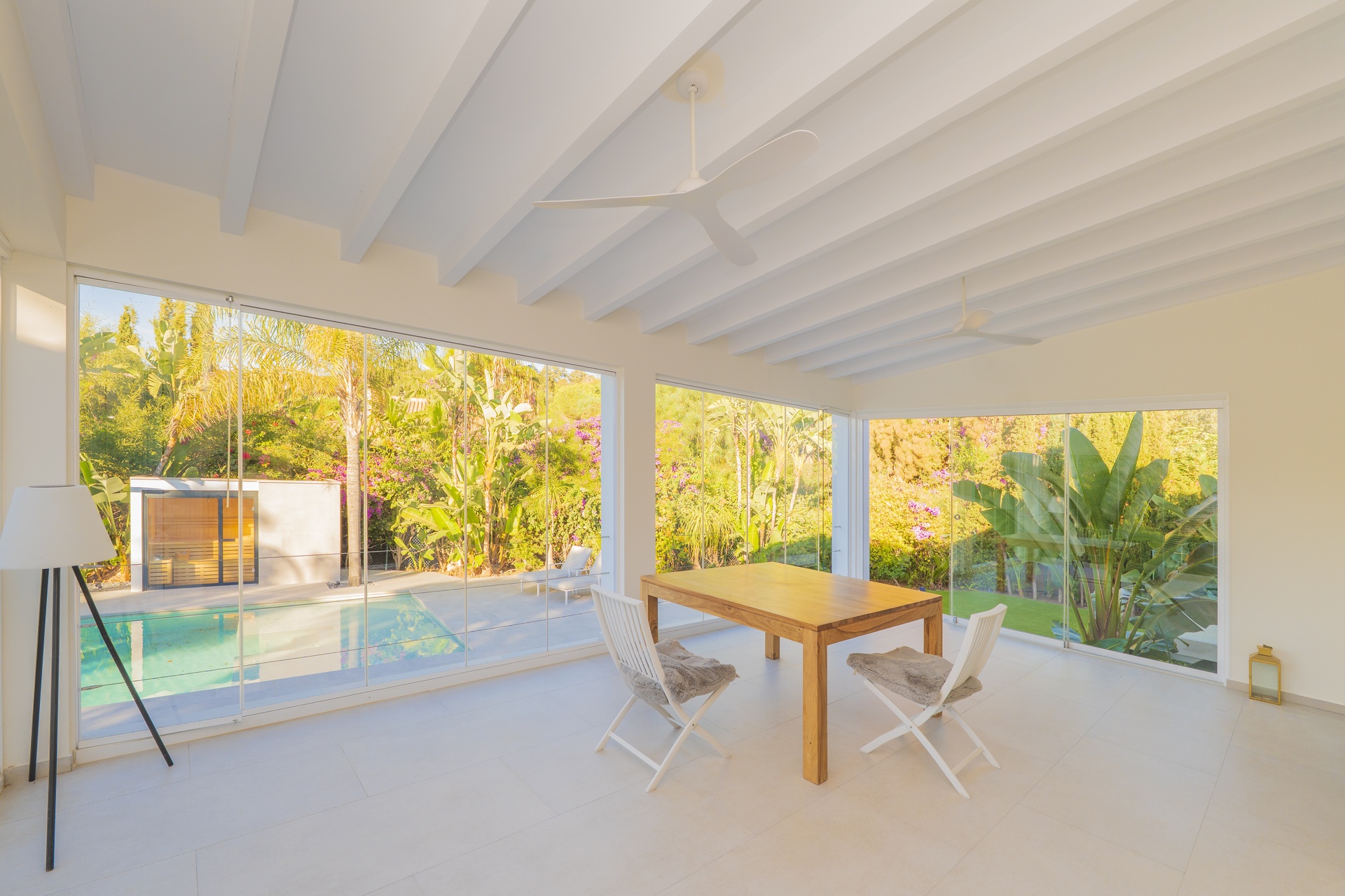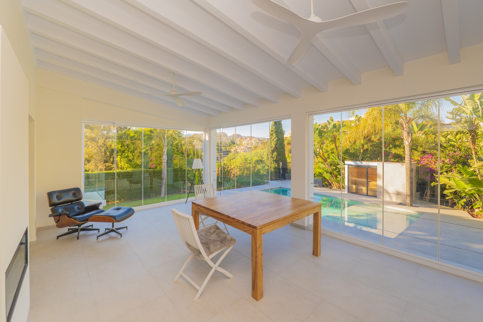 Las puertas acristaladas de gran formato se abren a una espectacular terraza cerrada con sistema de cristal plegable, creando una transición perfecta entre el interior y el exterior.